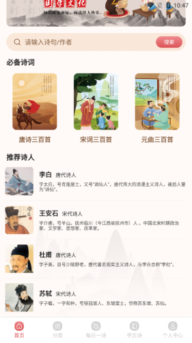 唐诗宋词:这是一款学习唐诗三百首、宋词三百首、元曲三百首、小学诗词、初中诗词、高中诗词的古诗词软件,不但适合中小学生学习古诗词使用,