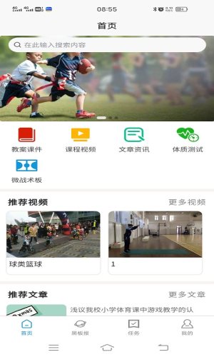 老师可以查看教案、视频课件、文章咨询,可以录入学生体测信息、查看学生体测信息,创建篮球、足球、羽毛球等战术板