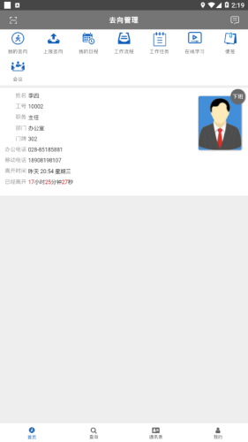 一款适合机关、企事业、医院、学校等使用的人员去向动态管理工具,可查询和管理工作人员的当前去向状态,预设定位和偏离办公地点距离值后,可及时提醒工作人员变更自己的去向状态。