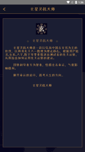 玄星灵机大师app是一款以弘扬中国古文化为主的软件,以周易先天八一数理为理论核心,根据用户姓名、生辰、八字、数字等要素推演出用户的先天运势,从而给出如何运用先天运势的建议。