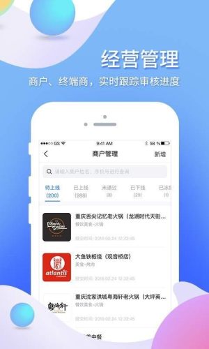 按状态分类的商户管理标签,有待上线、已上线、未通过与已下线不同状态分类;