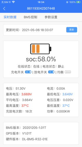 云BMS app可实现远程控制电池组充放电、重启及修改电压、温度等参数保护值。