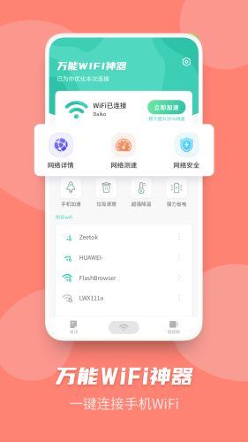 万能WiFi神器App,为您提供更多安全的免费wifi网络,让wifi连接快速更快,让网速效果优化到最大,并且还能帮助您清理手机中的垃圾,优化手机运行效率哦!