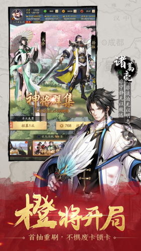5、无需担心开荒阵容,首抽无限重置,抽到满意再开局。打破传统锁卡禁锢,百位名将悉数登场,无双阵容随心搭配,每位主公皆可大展宏图霸业。