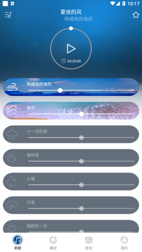 雨声、风声、雷声、柴火声、风铃声、咖啡馆的声音,还有猫打呼噜的声音,多种组合方式,每种声音都可以单独调音量,可以全部声音融合在一块播放。