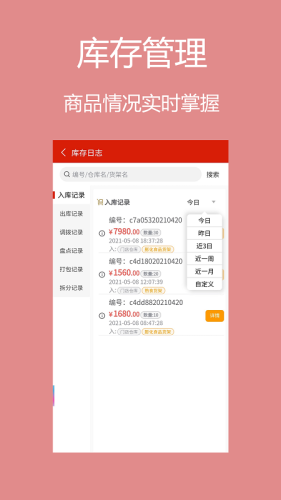 入库、出库、调拨、盘点、打包、拆分等库存日志管理,甩手掌柜门店进销存app轻松查询每件商品去处,清楚库存数量,及时补货。