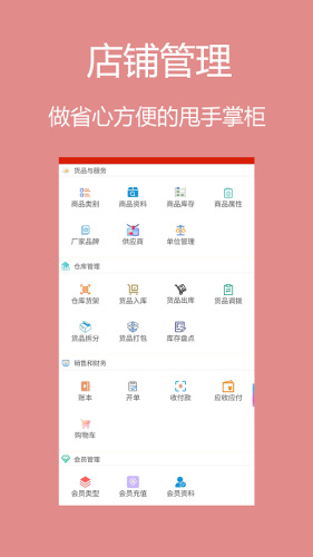 针对货品与服务、仓库、销售和财务、会员管理等,甩手掌柜门店进销存app帮助您更好的管理如商品、出入库、账本、供应商、会员等重要事项,您只需要做省心的甩手掌柜!