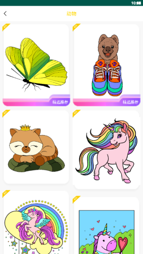 六大分类满足孩子的绘画需求,根据喜好来选择图形类型,包含:水果、动物、生肖、蔬菜、挑战、卡通。每个分类下继续选择,一定有你喜欢的哪一张图形哦!