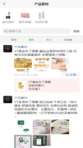 1、拥有海量产品素材,美妆的、营养保健的、护理的产品素材婲蜜app都有;