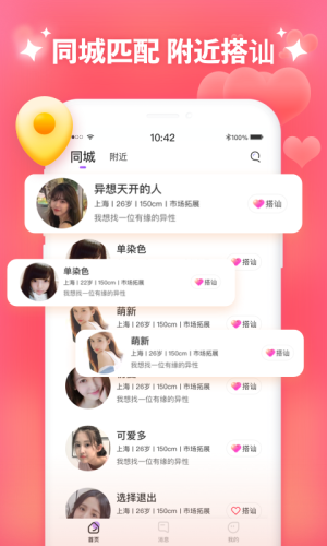 在这里,你可以通过搭讪,文字,语音,视频等方式与同城附近异性进行聊天互动,来同城附近聊寻找你心仪的另一伴、红颜蓝颜知己吧!