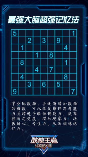 好玩又益智的游戏?非数独大师莫属了!《数独王者》是一款数字益智游戏,根据盘面上的已知数字,利用规则和推理使每个数字在每一行、每一列和每一宫中都只出现一次,并在最短时间内填充完。非常考验观察能力和推理能力,是锻炼大脑的好办法,消遣时间的极佳方式。