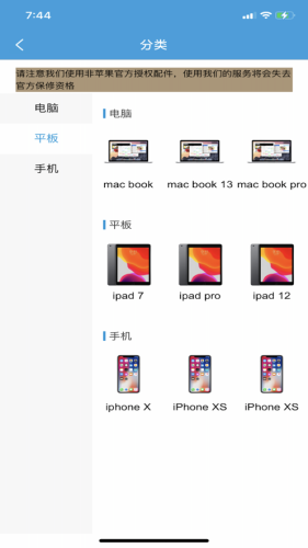我们支持包括苹果手机、iPad、苹果笔记本等产品的维修。