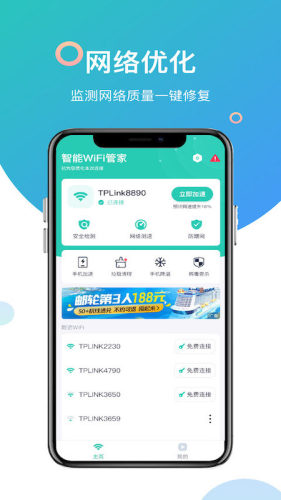 智能WiFi管家是一款非常优质的网络管理服务软件,软件功能非常强大,这里提供免费连接网络、网络监测、网络优化、一键加速等多种功能,能够有效防止蹭网,让你上网更便捷!