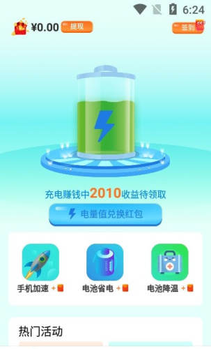 2、实时充电,通过电量值兑换红包,还有签到红包可以领取;