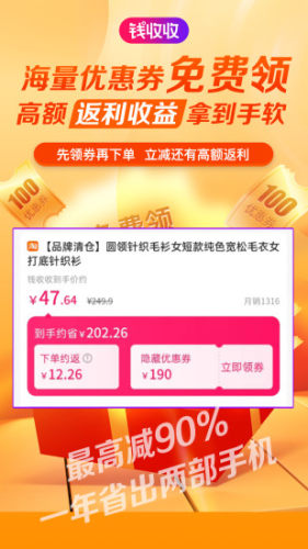 钱收收app是一款购物抢红包的软件,在这里,购物种类样样齐全,美食、茶道、居家、母婴等任由选择,用户不仅可以买到自己心仪的商品,还可以在购物的同时领取大额的优惠券和返利红包,省钱还赚钱。