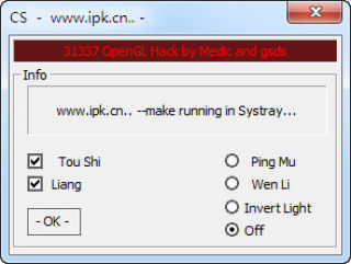 本透视作弊器适合任何CS版本,适合单机,局域网,网络对战平台!浩方,宽带中国,战网,QQ等平台!(测试所有,都可以透视)使用本外挂必须把你的CS的视频模式,设置为“openGL"模式,否则无效!说明:首先打开”“CS透视作弊器”,点击“OK",确定!即可进入游戏!