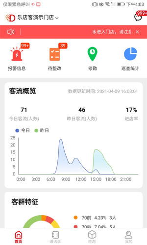 店望App,通过大数据与海量资源为商品运营赋能,提供了客流统计、客群特征、客流销售额、热力分析、到店顾客、考评、点评、线下巡查、考勤、工作汇报、内部公告、客户管理、任务管理、费用管理、出差申请以及请假申请等等功能。