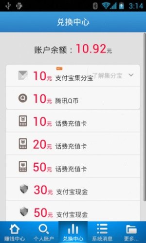 - 礼品兑换,可兑换移动/联通/电信充值卡话费、Q币、支付宝,现金话费随你拿