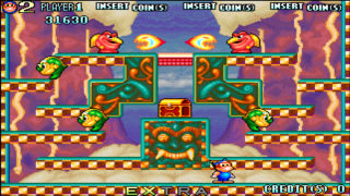 雪人兄弟2代机厅我并没有见过,所以感情不深,但是大致的玩了几次,感觉东亚企划由于搁了4年才制作续作,系统和趣味性还是大有长进的,明显的吸收了很多后来出现的定搬游戏的风格,如收集字母来奖命,主角可以向下跳。不过这次的游戏主角不再孤单,除了雪人兄弟外,还有其他三位特异功能男孩鼎立加盟,分别拥有雷,水,风的力量。