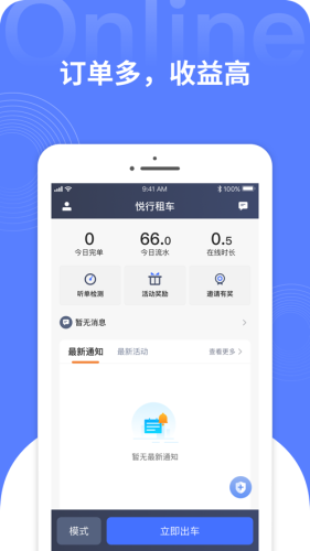 悦行租车app,专为司机打造的网约车接单软件,提供更专业、更优质的打车接单服务,丰富订单尽在其中,轻松抢单,快速赚收益,为司机带来更多赚钱机会。