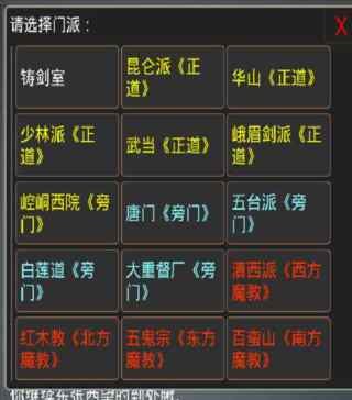 昆仑,少林,华山,武当,峨眉剑派,崆峒派,唐门,五台派,白莲道,大重督厂,滇西派,等等。