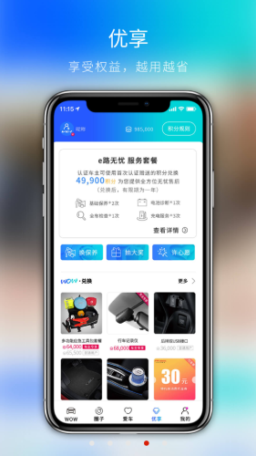WOWSTATION app是一款非常好用的车载互联手机app,将汽车和手机app相连接以后,可以直接查看汽车的电量和续航里程,支持发出紧急救援通知,还可以在优享商城里购买商品。