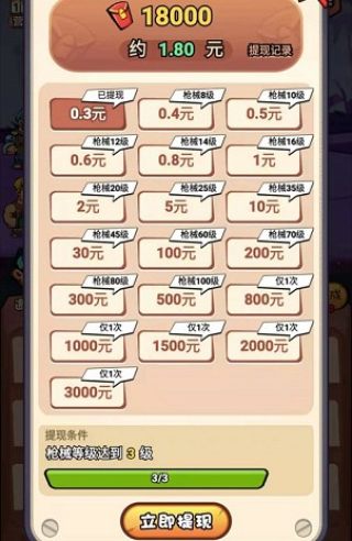 提现方面最低满0.3元即可提现,提现要求要求除了有足够的红包劵之外,还需要达到规定的枪械等级,0.3元就需要将枪械等级合成至3级,0.4元需要详细等级达到8级,后面提现金额越高,那么规定的枪械等级越高。