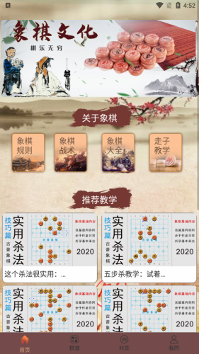 1、学习各种象棋教学知识,从首页的教学推荐中挑选某教学内容即可打开学习;