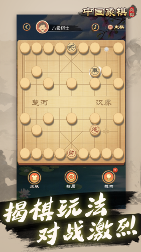 13、对弈模式。即跟电脑一对一的对弈的模式,多种难度的电脑任你选择,适合各种水平的玩家,还能自己选择背景音乐,听着古典的音乐来上一局象棋,岂不是美哉妙哉。