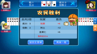 游戏由三人玩一副牌,一副牌 54 张,一人 17 张,留 3 张做底牌,在确定地主之前玩家不能看底牌。地主为一方,其余两家为另一方,双方对战,先出完手中牌的一方胜。胜负判定任意一家出完牌后结束游戏,若是地主先出完牌则地主胜,否则另外两家胜。