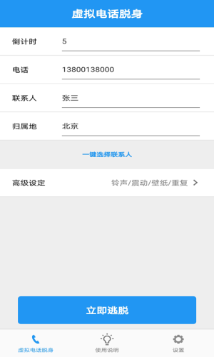 领导、同事、长辈、朋友、恋人来电、统统可以自定义。一款简单实用的虚拟电话软件,脱身的好帮手。