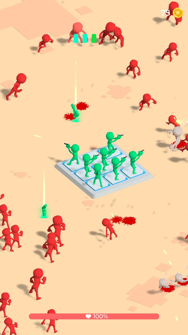 清新简约的画风带给玩家清爽愉快的感觉,在小小的方块上放置火柴人来抵御经过的敌人,游戏中的敌人进攻的规模会越来越大,玩家必须要升级自己的人物,提升己方战斗力,优先消灭速度快的敌人。