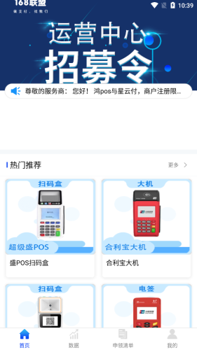 APP专为盟友打造, 实现线上一建申领机具, 每日实时追踪订购机具的交易流水, 归纳展示各项机具的收益, 线上精致便捷的推广宣传图片, 简洁明了的推广语等等, 更是盟友的推广利器。