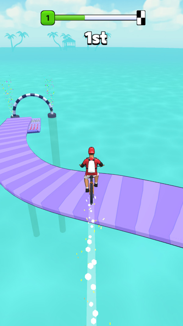 1、加速你的自行车,在湖边的木桥上保持平衡,然后到达终点。