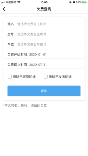 5、【缴费管理】通过后台提交每个住户的物业帐单,随时随地查看各小区业主欠费缴费情况