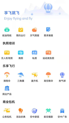 享飞就飞app是一款综合航空服务软件平台,用户可以通过享飞就飞app选择飞行服务,app提供无人机驾照学习,滑翔伞,公务包机等各种服务。