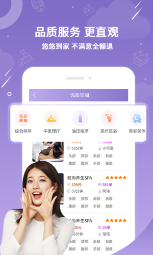 悠悠平台是同城上门推拿平台,汇聚上门推拿 SPA、小儿推拿、中医等品类,为手机用户提供高价值高标准的养生健康、保健的体验