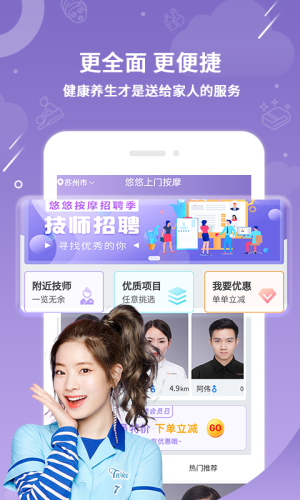 一键预约,轻松体验。悠悠app现已经覆盖苏州、无锡、常州、南京、北京、上海、重庆、深圳重庆,武汉,等多个城市服务于上门养生推拿垂直领域。