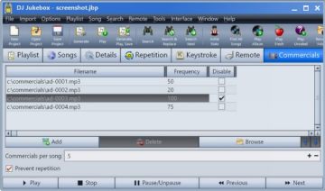 DJ Jukebox 可以在歌曲之间插入广告。广告可以是媒体播放器支持的任何类型的媒体文件。可以调整每首歌曲的平均广告数量,并且可以为单个广告分配一个频率等级,以确定它们被选择的频率。