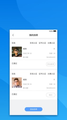 这是专门服务于技师商户端APP,是专门为商家的技师提供统一管理,实现技师信息的审核、技师服务发布进行统一管理
