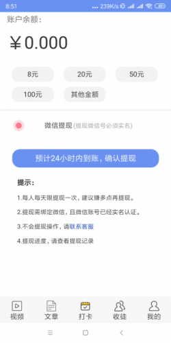 2、登录成功后,点击“视频”或者“文章”频道转发任意文章或者视频到微信,被阅读后就有现金奖励