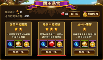在国王悬赏中也有可能获得30钻石每次任务,10次任务最多能获得300钻。