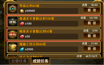成就任务是钻石获取的另一个重要途径。普通关卡星数达到100星以及精英关卡达到50星都能获得50钻。