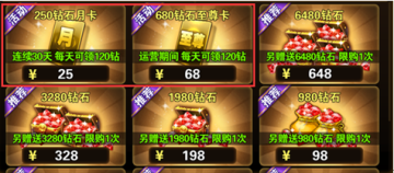 当然,如果你觉得这些钻石仍然不够你的使用,可以考虑充值250钻石月卡或者680钻石至尊卡,前者连续30天每天都能领取120钻,而后者在游戏运营期间每天均能获得120钻,是不是瞬间觉得很实惠?!当然,是走白手起家路线还是小康路线完全取决于玩家您的需要啦!