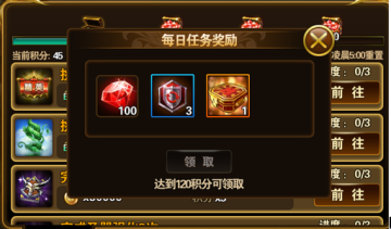 这个强烈推荐全部领取!日常任务积分达到30能获得20钻石,达到60能获得30钻石,达到90能获得50钻石,达到120能获得100钻石,总共200钻!