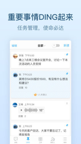 【DING】: 重要的事可以发送语音/文字DING,通过电话或短信100%送达,把重要事项管理起来;