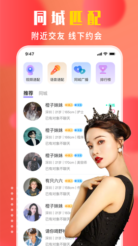 遇见身边的缘分,线上沟通,线下见面,同城交友附近的人,快速脱单!