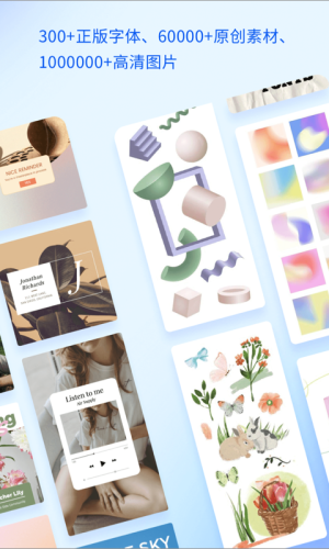 懒设计有海量原创设计模板、300+款正版字体、6w+个矢量素材、100w+张高清图片,正版保障。找到正版资源,使用高效工具,1分钟出图,让作图从此不头秃!