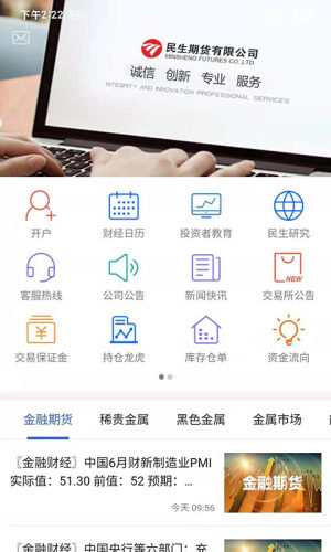 民生期货App,给您最便捷的掌上期货交易软件,在此可以一键开户成为合格的期货交易者,并提供了期货、期权、股票期权、现货全市场行业以及掌上交易功能。