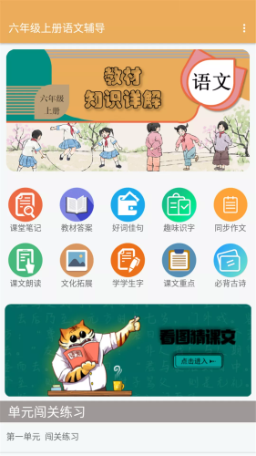 六年级上册语文辅导是一款非常优质的小学语文学习服务软件,软件功能非常全面,这里汇集了海量的语文学习资源,提供知识详解、课堂笔记、课文朗读、教材答案等多种学习功能,帮助孩子高效学习,操作便捷,感兴趣的朋友赶紧来下载吧!